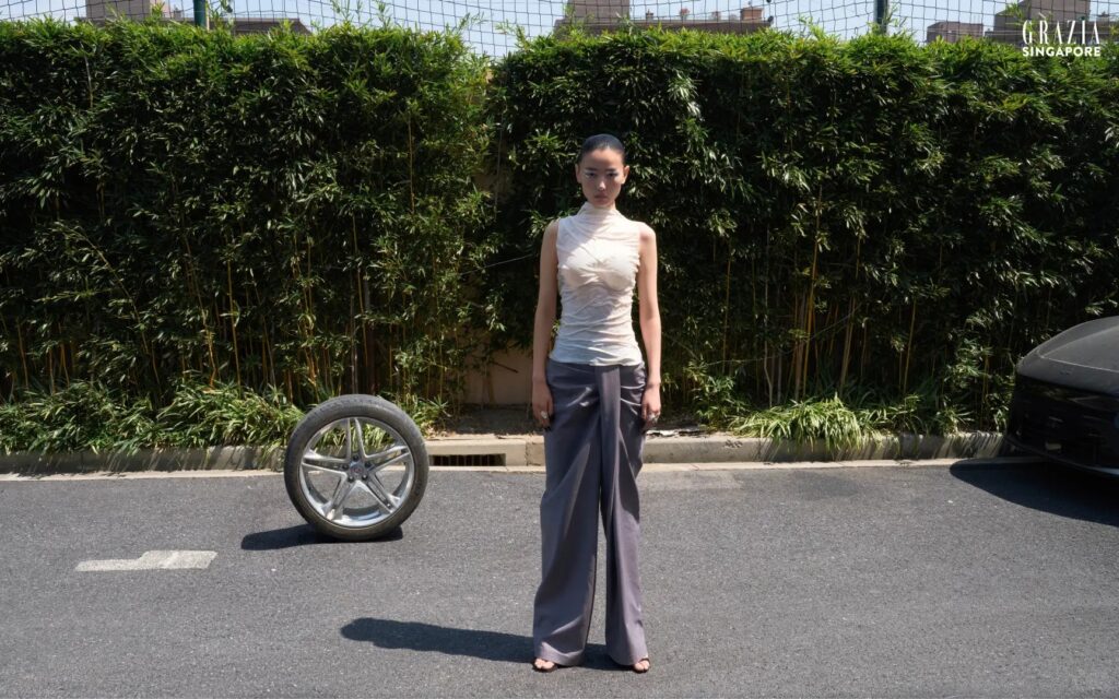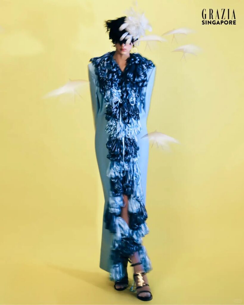 Grateful to model Cui Houjing for interpreting the skin-toned silicone female torso top, grey asymmetric ruched wide-leg trousers and gold gift box ribbon sleeveless dress from Maggie Wang’s 2025 Spring/Summer Runway Collection for GRAZIA Singapore. Producer: Pakkee Executive Producer: Shi Tou Photography: C Nan Styling: EMIS LEE Make-up & Hair: Shi Tou Model: Cui Houjing […]