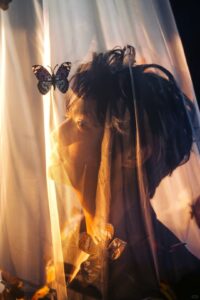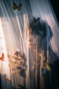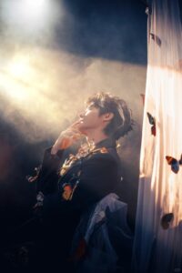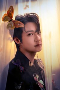 Grateful to Zheng Yecheng for his special birthday interpretation of the Black Wool-Blend Waisted Coat with Butterfly Specimen Detailing from Maggie Wang’s 2025 Autumn/Winter Haute Couture Collection.