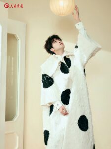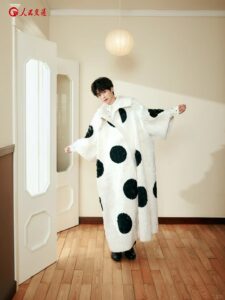 Grateful to Zi Yu for interpreting the Black and White Feather Polka Dot Coat, White Cowl Neck Satin Blouse, Buttoned Leather Shoes, Wooden Butterfly Bow Tie and Wooden Curly Floral Leather Shoes from Maggie Wang’s 2025 Autumn/Winter Haute Couture Collection on the cover of People’s Transportation Magazine.