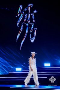 Special thanks to the models for their exquisite interpretation of Maggie Wang’s 2025 Spring/Summer Runway Collection at the gala — including the blue double-sided polyester gift ribbon overcoat, blue sequined gift box printed T-shirt, black double-sided polyester gift ribbon waist cincher, brown updo padded shoulder piece, green polyester ribbon button leather shoes, as well as the white goose down feather flat cap from the Haute Couture Collection. Each piece carries a modern reinterpretation of the cultural tradition of festival gifting. Integrating structuralist aesthetics with innovations in textile craftsmanship, it transforms the form of a “gift” into the meaning of “conveyance”, implying that fashion can also serve as a carrier of emotions and culture.
