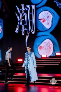 Special thanks to the models for their exquisite interpretation of Maggie Wang’s 2025 Spring/Summer Runway Collection at the gala — including the blue double-sided polyester gift ribbon overcoat, blue sequined gift box printed T-shirt, black double-sided polyester gift ribbon waist cincher, brown updo padded shoulder piece, green polyester ribbon button leather shoes, as well as the white goose down feather flat cap from the Haute Couture Collection. Each piece carries a modern reinterpretation of the cultural tradition of festival gifting. Integrating structuralist aesthetics with innovations in textile craftsmanship, it transforms the form of a “gift” into the meaning of “conveyance”, implying that fashion can also serve as a carrier of emotions and culture.
