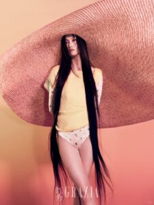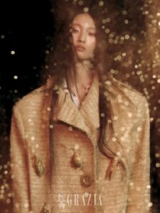 Grateful to model Liu Tinglei for interpreting the gold insect-woven overcoat and sustainable corn stalk-woven straw hat from Maggie Wang’s 2025 S/S Runway Collection for @GRAZIA.