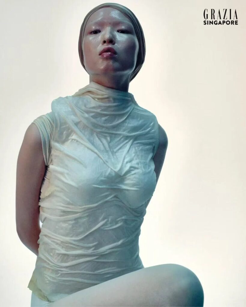 Grateful to model Zeng Zhuolin for interpreting the skin-toned silicone female torso top from Maggie Wang’s 2025 Spring/Summer Runway Collection for GRAZIA SINGAPORE.