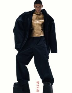 Grateful to the models for interpreting the gold muscular leather-sculpted top and silver metallic muscular top from Maggie Wang’s 2025 S/S Runway Collection for @Harper’s BAZAAR.