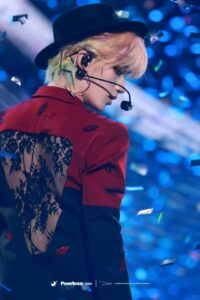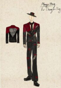 Grateful to Ding Chengxin for presenting the rhinestone lip print black and red patchwork suit set, matched with rhinestone red lip ribbon and rhinestone red lip hat from Maggie Wang’s exclusive custom collection at the Dalian stop of TNT’s Capping Ceremony concert Guan Jun.