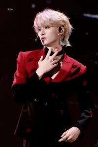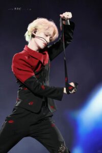 Grateful to Ding Chengxin for presenting the rhinestone lip print black and red patchwork suit set, matched with rhinestone red lip ribbon and rhinestone red lip hat from Maggie Wang’s exclusive custom collection at the Dalian stop of TNT’s Capping Ceremony concert Guan Jun.