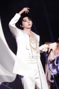 Grateful to Ma Jiaqi for presenting the pearl satin shawl collar suit set from Maggie Wang’s exclusive custom collection at the Shanghai stop of TNT’s Capping Ceremony concert Guan Jun.