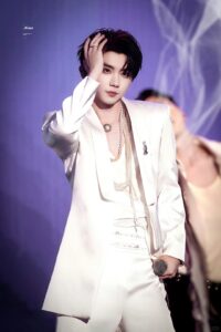 Grateful to Ma Jiaqi for presenting the pearl satin shawl collar suit set from Maggie Wang’s exclusive custom collection at the Shanghai stop of TNT’s Capping Ceremony concert Guan Jun.