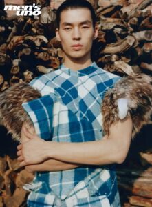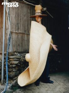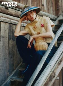 Grateful to model Li Xiangyu for interpreting the sustainable straw-woven slant placket top, sustainable corn stalk-woven straw hat, blue-green double-layered plaid feather water drop sleeveless Zhongshan suit and beige wooden scroll flower sleeveless top from Maggie Wang’s 2025 S/S Runway Collection for @men’s uno.