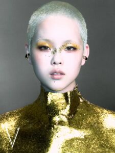 Grateful to COCONA for interpreting the gold sheepskin leather-sculpted male torso dress from Maggie Wang’s 2025 Spring/Summer Runway Collection for V Chinese Edition.