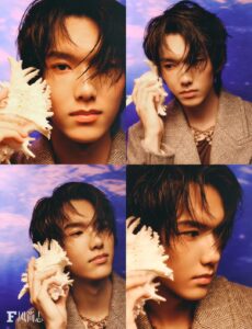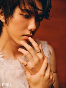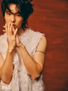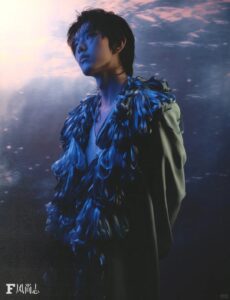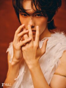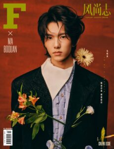 Grateful to Ma Baiquan for interpreting the blue reversible polyester gift ribbon overcoat, blue striped layered shirt, brown cut-out button top and white French-collar shirt from Maggie Wang’s 2025 S/S Runway Collection, as well as the white feather sleeveless top from the 2025 S/S Haute Couture Collection, on the cover of @Fashion Weekly.