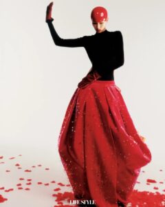 Grateful to Ouyang ying for interpreting the black and white feather polka dot overcoat and firework rose red velvet overcoat from Maggie Wang’s 2025 A/W Haute Couture Collection on the cover of @Lifestyle Weekly.
