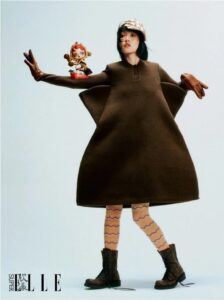 Grateful to Pan Haowen for interpreting the pieces from Maggie Wang’s Spring/Summer 2025 Runway Collection on SuperELLE – including the blue-green double-layer plaid feather water-drop sleeveless Mandarin jacket, the peacock blue double-sided polyester bow baseball cap, the natural wood puzzle baseball cap, and the white goose down feather baseball cap.