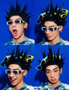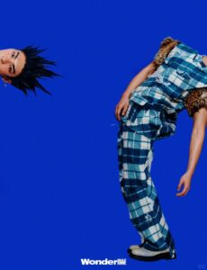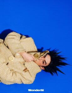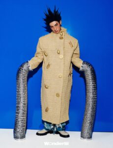 Grateful to Yan An for interpreting the blue-green double-layered plaid feather water drop sleeveless Zhongshan suit and gold insect-woven overcoat from Maggie Wang’s 2025 S/S Runway Collection on the cover of @Wonderland..