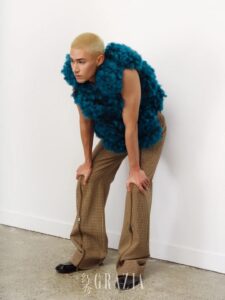 Grateful to Mika for interpreting the blue curly textured sleeveless top from Maggie Wang’s 2025 S/S Runway Collection on the cover of @GRAZIA.