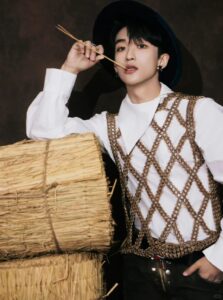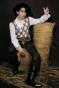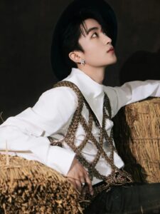 Thank you to Huang Zihongfan for his stage performance of Maggie Wang’s 2025 Spring/Summer collection featuring white French collar shirts and brown open-button tops.